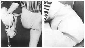 The traditional device prior to 1954 consisted of a molded leather socket with a laterally placed locking hip joint called a tiltingtable prosthesis. Often shoulder straps were required for suspension. Gross pelvic thrust was required to propel the prosthesis, and a vaulting gait was common. A radical departure, later termed the "Canadian" design, was introduced by McLaurin in 1954 (Fig21B-2). This unique approach demonstrated the feasibility of using unlocked hip, knee, and ankle joints that relied on biomechanics to achieve stancephase stability while permitting flexion at the hip and knee during swing phase. This is now the standard for prosthetic fitting worldwide, and locking joints are very rarely necessary. A molded plastic socket encloses the ischial tuberosity for weight bearing, extends over the crest of the ilium to provide suspension during swing phase, and affords excellent mediolateral trunk stability by fully encasing the contralateral pelvis.The prosthetic hip joint is attached to the socket anteriorly, and this results in excellent stancephase stability plus good swingphase flexion.